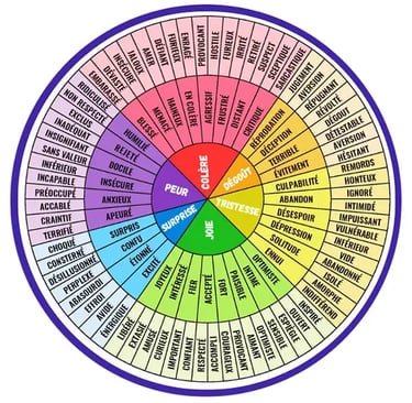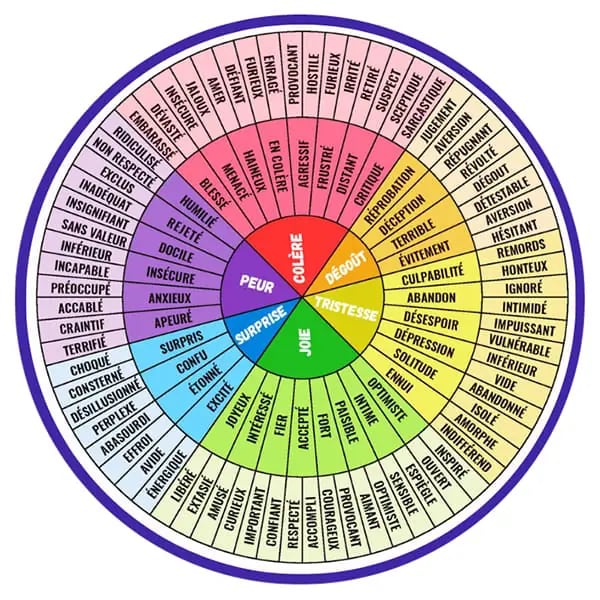 Par exemple, Anne ressent de la colère 🔥. Grâce à la roue, elle repère cette émotion au centre, en rouge foncé. En explorant la partie rouge clair, elle identifie un sentiment de menace ⚠️. Enfin, dans la zone rouge la plus claire, elle précise son ressenti : la jalousie.