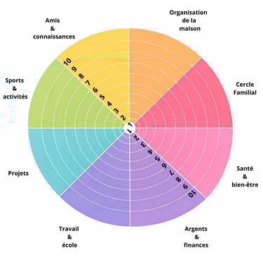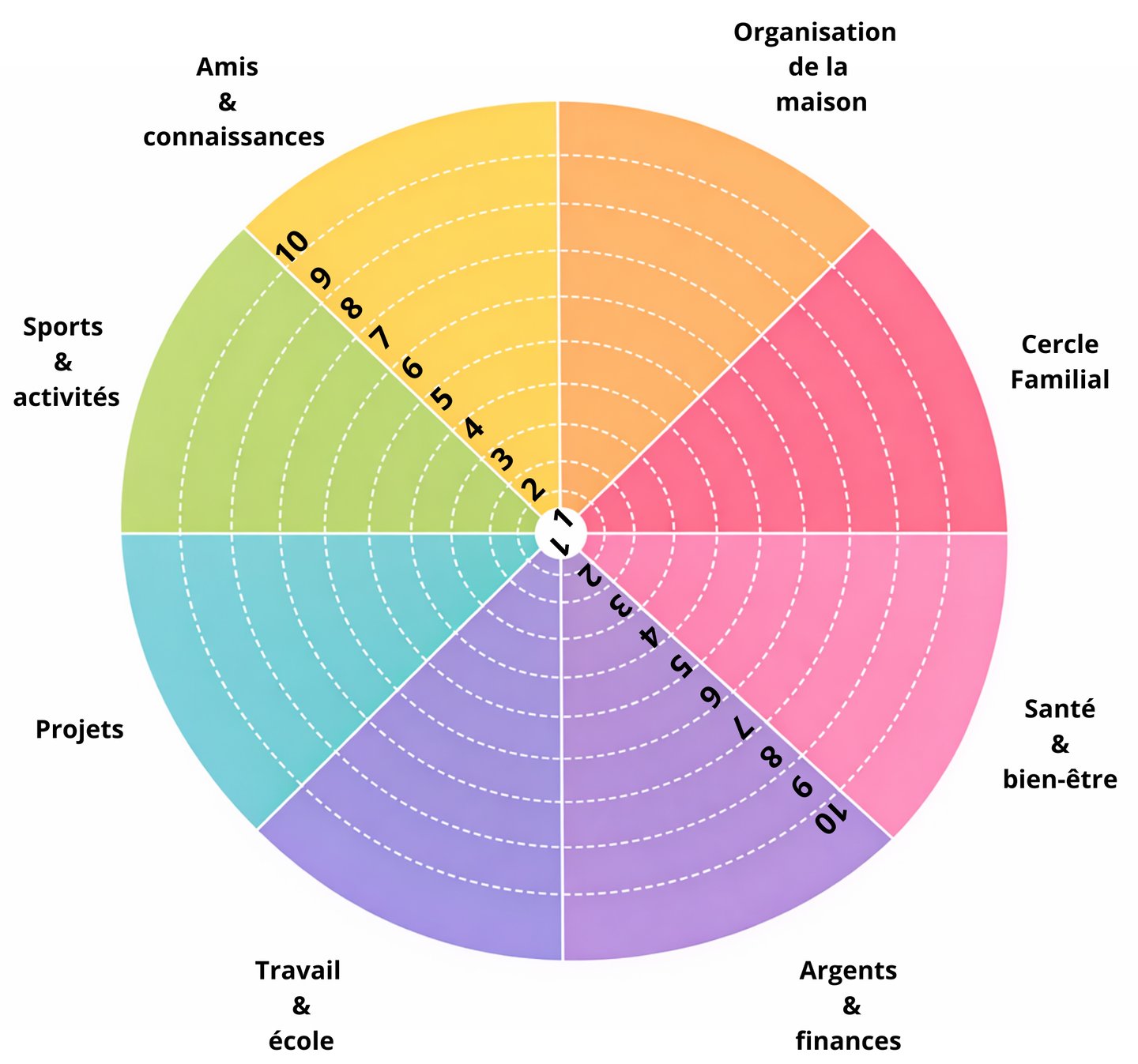 Légende : chaque portion (tranche) symbolise un domaine de vie. J’évalue chaque domaine, je note le score puis je relie les points pour trouver les déséquilibres.